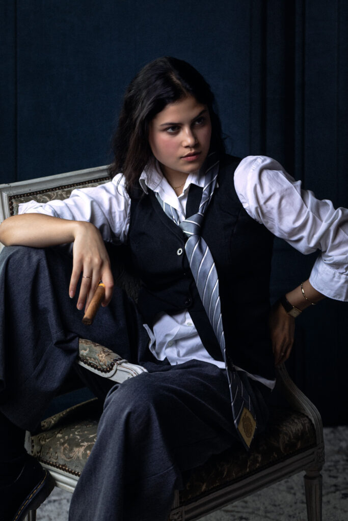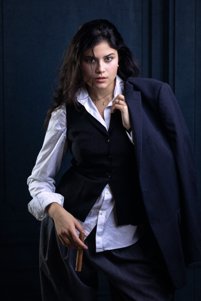 Portraits studio en couleur réalisés avec Ariana. Univers Peaky Blinders moderne : regard intense, tenues masculines, postures désinvoltes avec cigare. La couleur met en valeur tons de peau, textures et énergie contenue.