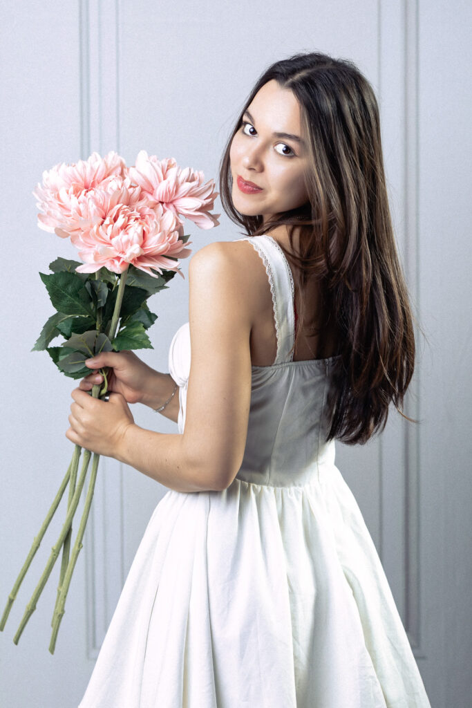 Séance portrait créative réalisée au studio Benoit Photo, Genève. Pivoines roses, lumière douce, fond clair et robe légère. Un souffle printanier volé à l’hiver, une renaissance intérieure incarnée par Rebeca. Portraits cinématographiques vintage, pétales délicats et regard contemplatif. Hiver 2026.